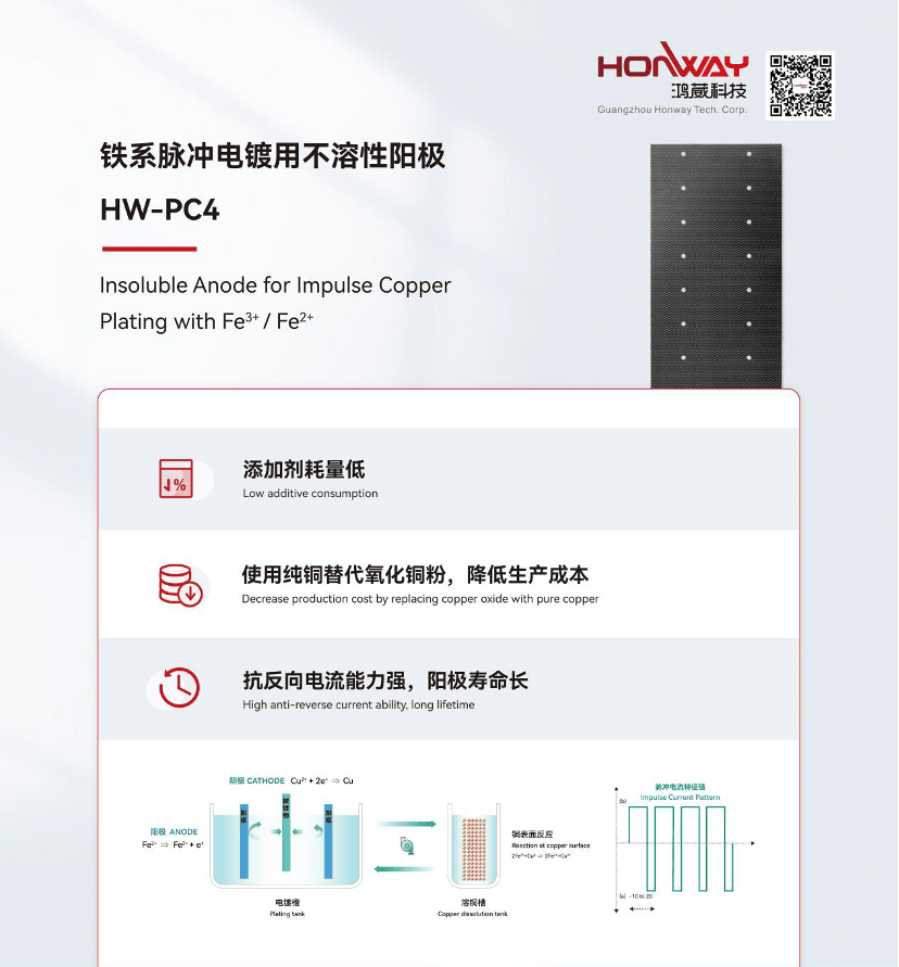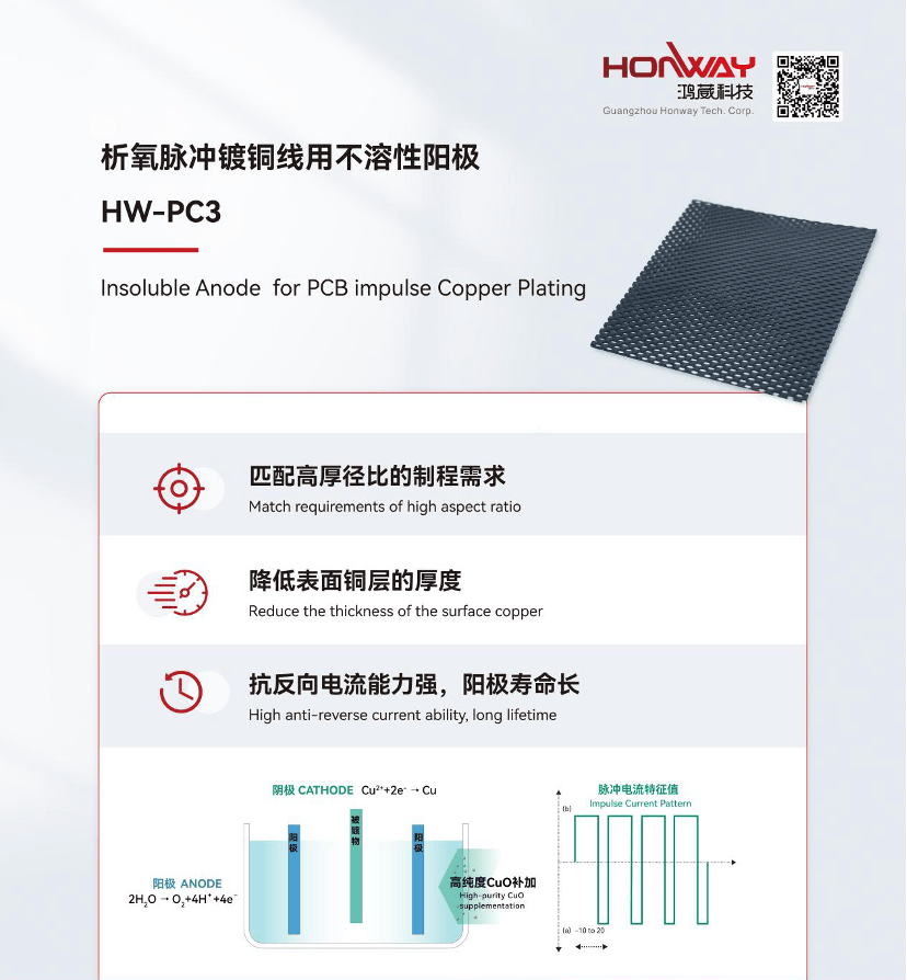 广州鸿葳科技有限公司(Guangzhou HonwayTechnology)创建于2010年,聚焦应用电化学技术领域,主要从事不溶性阳极、电子化学品、表面处理化学品及相关设备的研发、生产与销售。2025年,在通用电镀阳极的基础上,深化高端PCB制造领域相关阳极产品升级,拓展阳极市场,竭诚为客户给予强力技术支持及质量保障。